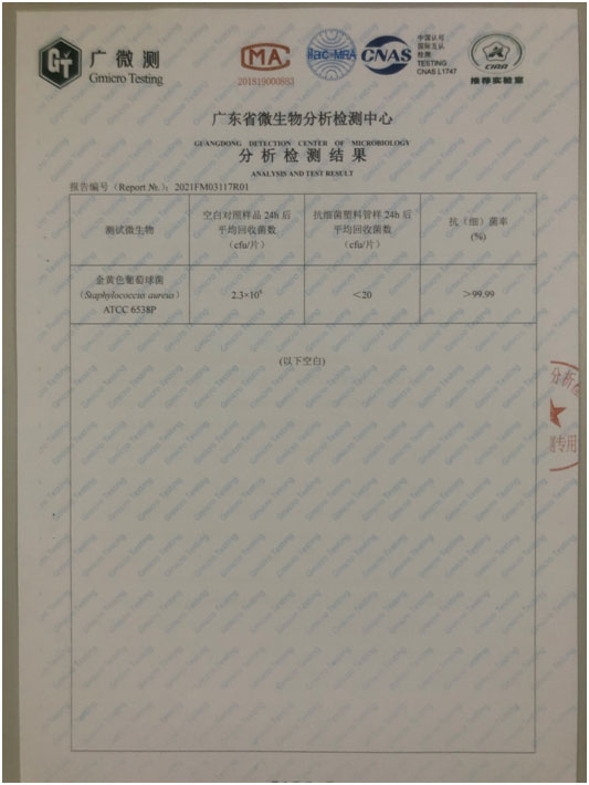 圖2是委托具備CMA、CNAS等資質的廣東省微生物分析檢測中心檢測,依據JC/T939-2004標準測試其抗菌性能得到的測試結果。測試結果表明,經24小時后,抗細菌塑料管樣抗菌率達到99.99%以上,說明我們的抗菌水管具備優良的抗細菌性能。