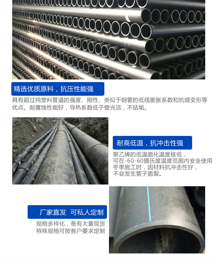 鋼的彈性模量通常是高密度聚乙烯彈性模量的200倍左右,由于鋼絲網骨架的加強作用使鋼絲網骨架聚乙烯復合管的剛性、耐沖擊性及尺寸穩定性優于任何一種純塑料管材。同時由于網狀鋼骨架本身又是一種柔性結構,從而使復合管在軸向上也有一定柔性。因此該管材具有剛、柔結合的特點,在裝卸、運輸、安裝的適應性及運行的可靠性方面均表現優異。地上安裝可節省支座數量,成本低;地下安裝可有效承受由于沉降、滑移、車輛等造成的突發性沖擊載荷。小口徑管材可適當彎曲,隨地勢起伏布置或蛇形布置,節省管件。